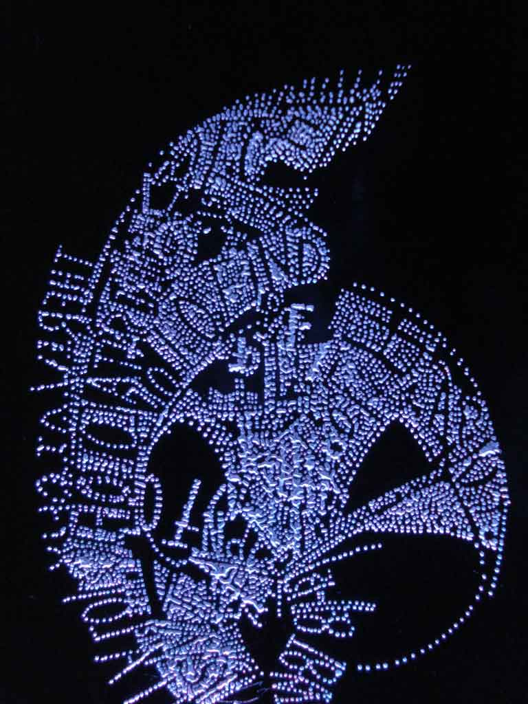 From a distance, her tiny graphite lines on chalky white panel appear like strings of silver pearls across the surface, whereupon closer examination we are confronted with an interwoven intimate musical network, a new text, calling us to enter and question our reading of literature in a visually compelling way.