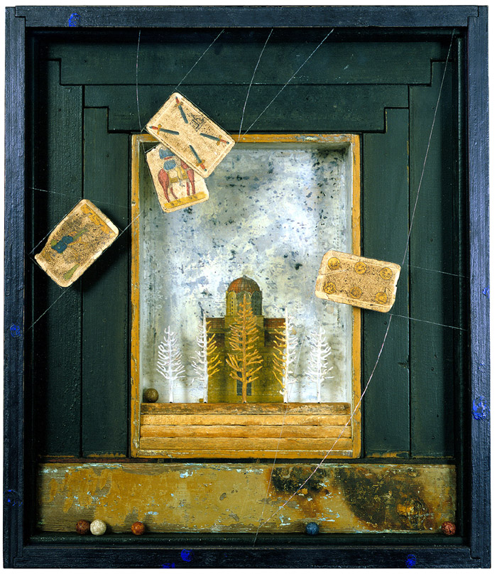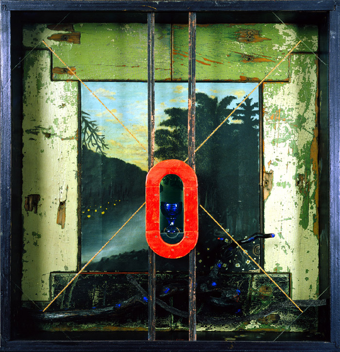 tempera and casein on constructed wood box, discarded wood, museum glass, antique