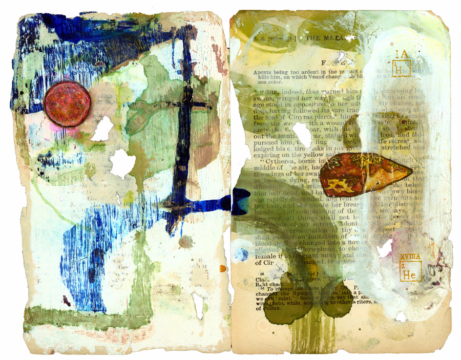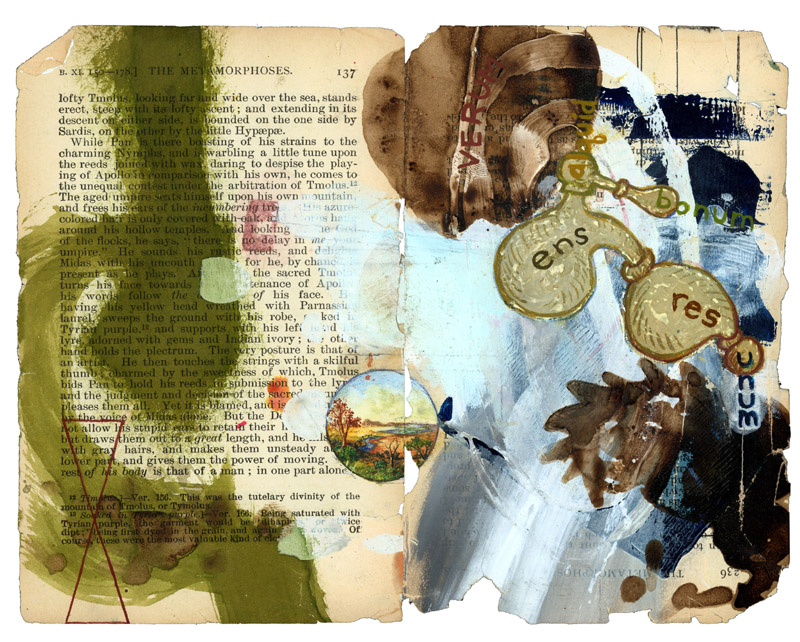 Ink, gesso, carbon paper transfer and water color on two pages from Ovid's "Metamorphosis"
