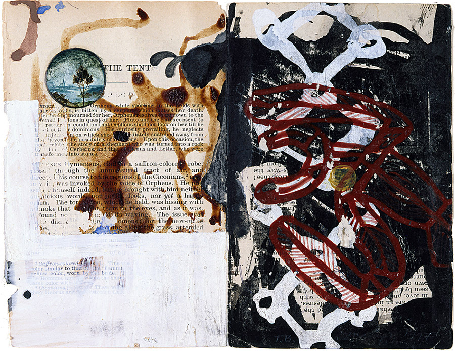 Blood, ink, shoe polish, gesso and acrylic on two pages from Ovid's "Metamorphosis"